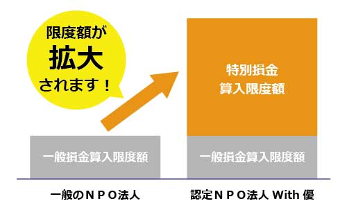 特別損金算入限度額:一般損金算入枠とは別に、認定・仮認定NPO法人にある特別枠 ( 資本金等の額 × 0.375% + 所得金額 × 6.25% )× 1 / 2
